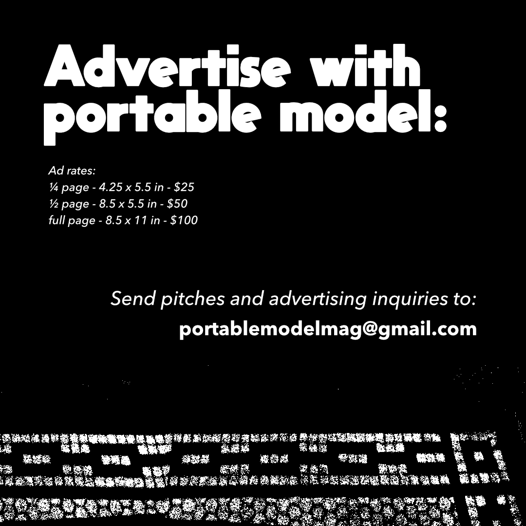 I'm taking pitches for the next issue of my music magazine, Portable Model. Please advertise if you've got something to sell. Please reach out with questions otherwise. Thank you !!!