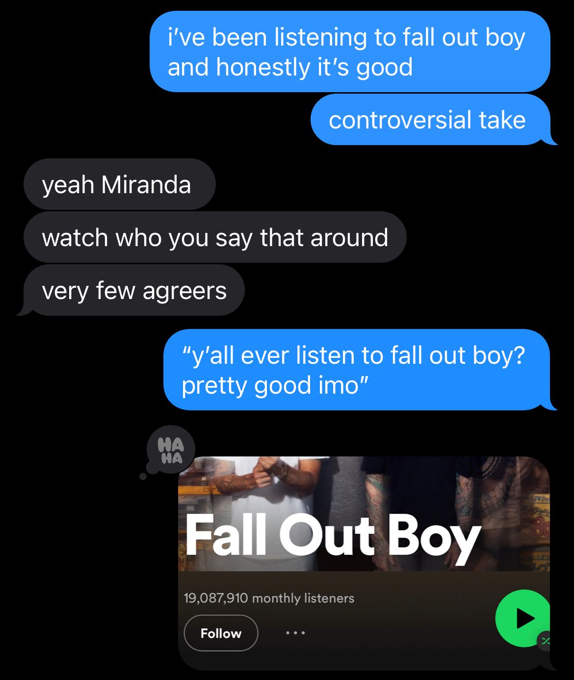 I do wonder if there is still a contingent of teenager that's like super into this kind of stuff? Are there still tweens dedicated to My Chemical Romance and Fall Out Boy? If not, what are they into? At least in terms of legacy, introductory emo. My Chemical Romance was like 2 years from breaking up when I was in 7th grade and Fall Out Boy was on hiatus before I started middle school at all. There was a wealth of their music available. Are they still the intro point? I'd be curious to know.