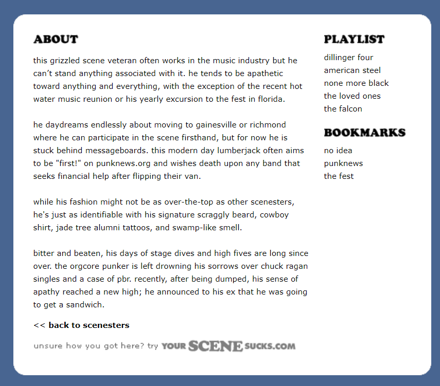 Before we move on, it's important to acknowledge yourscenesucks.com because if what I've been talking about doesn't really make a lot of sense to you, I imagine you at least know this guy. You've seen this guy.