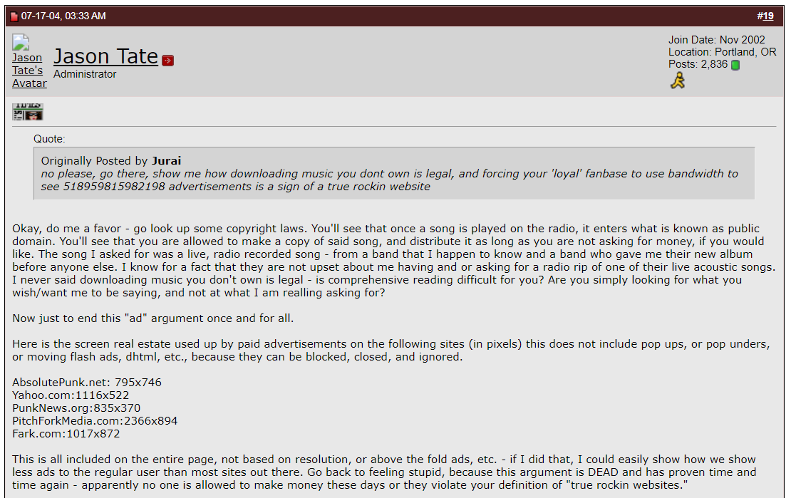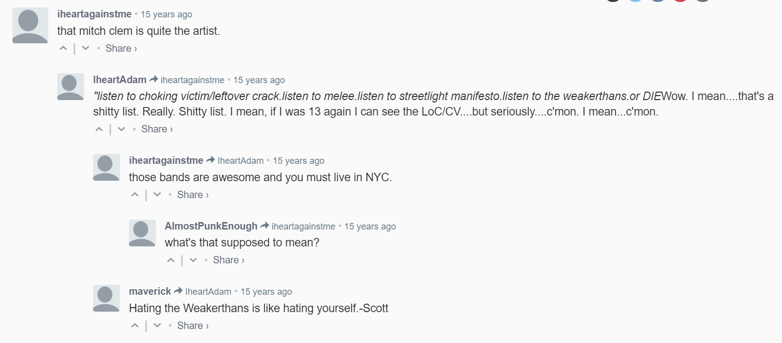 It's just, like, a really cute comment. This kind of stuff only exists in Facebook groups now which takes me, 2500 words into this, to something that matters a little more than defining a word that does a bad job describing a scene. I started looking into when orgcore was first used sort of as a joke that I thought would be funny to write about. Then I looked through punknews comments and desperately tried to find any trace of the old AsbolutePunk forums and looked through very old archived parts of the plan-it-x forums (yikes) and at one point found myself reading Weakerthans discourse on The Hold Steady's forums (Is the hold steady orgcore? ARE THE WEAKERTHANS PUNK?! Let me know what you think.) And after all that I found myself thinking more about the way the internet has changed in the last 15 years than anything.