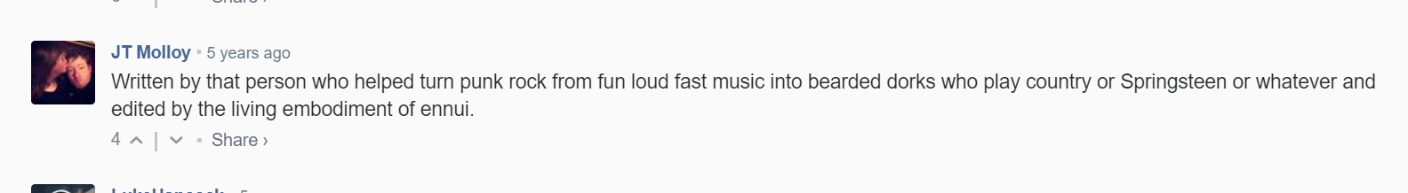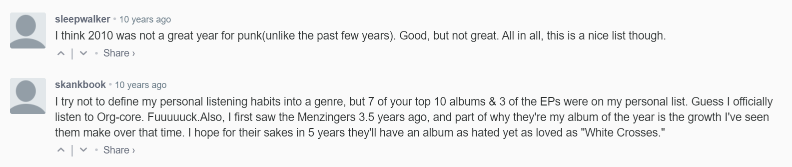 Both these comments are great. User sleepwalker just being like "this year was ok. good not great." is an objectively hilarious way to respond to a best of list. And user skankbook is predicting the future! Just the following year 50% of people would be commenting on the punknews exclusive stream of On The Impossible Past with how much they hate it! Can't imagine their later albums fared any better. Though the later albums probably don't have weird misogynistic arguments about whether stretchmarks ruin the album cover or not. Mixed bag there.