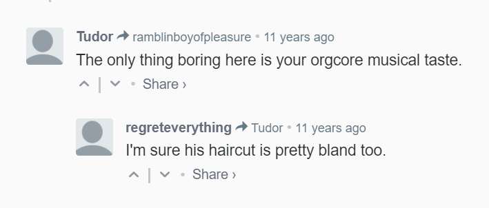 I don't want to say that forums are dead or internet in this vein is gone, it's not, but it is different! And it just feels so strange to read people be so forcefully mean to each other! I think about what it would be like if on Twitter someone tried to say that they just fucking hated a band and thought you were stupid if you liked them and it's just.. it couldn't happen. You can hardly say you're not sold on a band without a wave of teenagers telling you to just let people enjoy things.