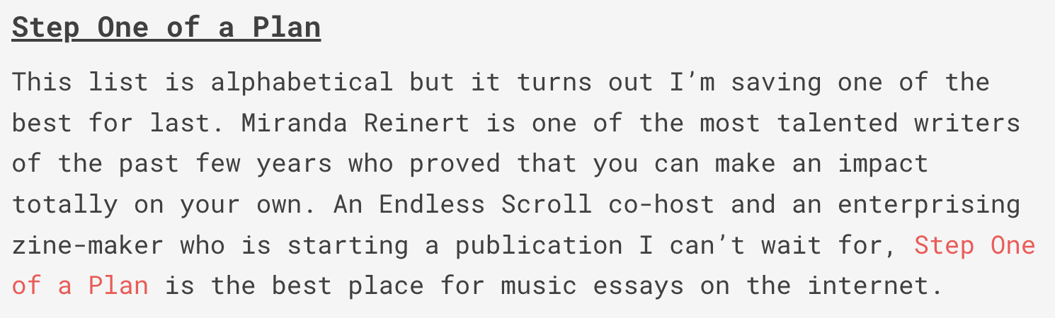 I started this newsletter at an advantageous moment. July 2020 was maybe the best time to start self publishing online. People had a lot of bandwidth and enthusiasm for it. I found support from a lot of writers I was a fan of and people who would become my friends– I met my friends and co-hosts of Endless Scroll because I wrote about Anthony Fantano early on. I consider myself lucky to have started it at that moment from an audience perspective, but starting it at any point would have helped me with my sense of self and my trajectory as a writer.