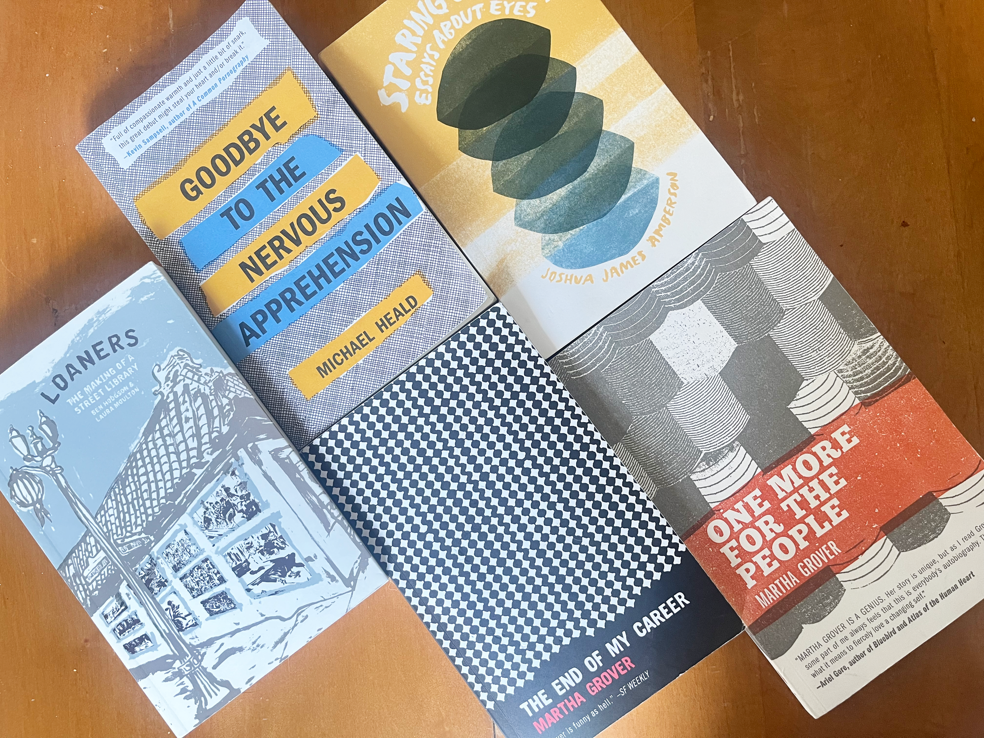 I read a book recently called Goodbye to the Nervous Apprehension. It's by Michael Heald and was published by Portland small press Perfect Day Publishing back in 2012. I bought it from my local independent, mostly used bookstore, Uncharted Books in Andersonville. It was being sold for list price (a very reasonable $10) so I imagine it's new. In going on their website for the first time, I found I've 5 of 10 of the Perfect Day publications– the Heald book, Staring Contest: Essays About Eyes by Joshua James Amberson, both Martha Grover books, The End of My Career and One More for the People, and Loaners: The Making of a Street Library by Ben Hodgson & Laura Moulton.
